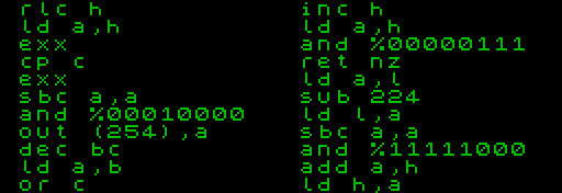 No unusual knowledge or types of tools that weren't already known in the 1980s are used here. I also didn't use any game-making engine, high-level language, program library, sound/music editor, PC/Mac graphics editor, in-game data compression, automatic code generation or generative AI model (it would damage my joy of creating). And I didn't use any part of a program of another game from any computer or game console. This game is written manually in assembly language in the old JOE text editor and compiled with Pasmo, the graphics (including the loading screen) are drawn manually in Art Studio in a ZX Spectrum emulator and converted using a home-made BASIC program, the sound is also written in assembly language.