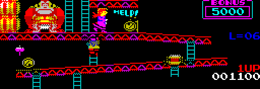 This game is for Sinclair ZX Spectrum and compatible computers and is based on the arcade game Donkey Kong (ドンキーコング) from 1981, designed and published by Nintendo (任天堂) and programmed by Ikegami Tsushinki (池上通信機). This version is freeware, I don't charge any money for it. I made it for fun, as a programming challenge, and as an exercise in how to solve the well-known colour limitations of ZX Spectrum. All arcade authors are credited in the game, I kept the game title and, in appropriate places, the name of the arcade publisher, as I make no claim to originality of the game ideas. It is a tribute to the creators of Donkey Kong and a demonstration that anyone can make nice-looking and well-playable games, even for very old, cheap, slow, and funny home computers that weren't designed for games.