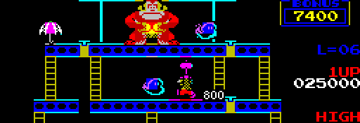 This is my first finished assembler game. I worked on it from 2022 to 2024 while learning assembly language, finished it in September 2024, and released the first version to a limited number of people in October 2024 to get some feedback and drive them mad. Probably the main attraction are colours, for which I had to figure out a wacky graphic system to reduce the Spectrum "colour clash" and make an illusion of several new colours. I am not a Donkey Kong expert and if I remember correctly, I had never played it until shortly before I started working on my version, but I tried to make the game as good as possible. I also never intended to make remakes of arcade games, so this is an exception that was made as a world-important barrel-throwing ape experiment.